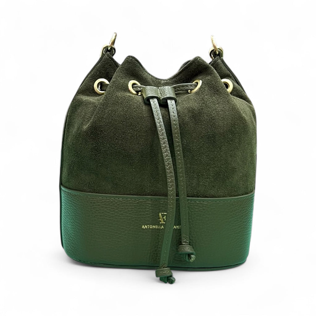 Realizzata in pregiata pelle scamosciata, questa borsa a secchiello combina eleganza senza tempo con un design funzionale. La texture morbida e la silhouette strutturata offrono versatilità sia per occasioni casual che formali. Dotata di tracolla regolabile e scomparti interni sicuri per mantenere gli effetti personali organizzati, preservando al contempo un'estetica sofisticata.