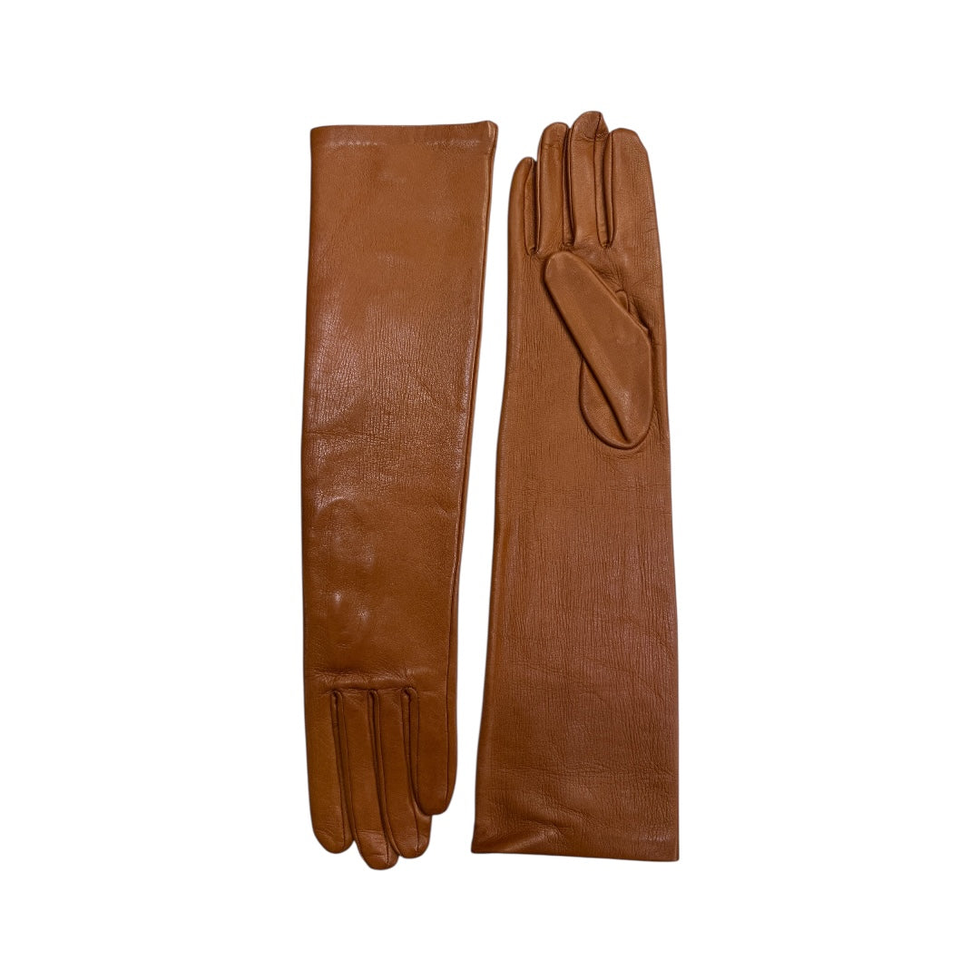 Gloves for women made of 100% lambskin, with a length that reaches the elbow. They are lined with 100% silk, which makes them soft and comfortable against the skin. Please note that these gloves contain non-textile parts of animal origin.